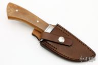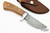 This Skinner by Journeyman Smith Michael Ruth features a Damascus blade with hamon line, .216" blade stock and 1.444" blade depth, hidden/mortise tang construction. The handle has a stainless steel guard, black and stainless steel spacers, 2-piece mammoth ivory grip with stainless pins. Comes with a brown leather sheath with belt loop made by Kenny Rowe's Leather. Excellent condition.