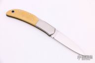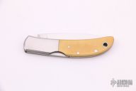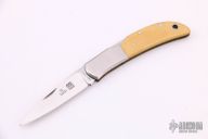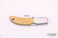 This knife by Al Mar features a mirror finished blade with nail nick. The handle has stainless steel bolsters, yellow paper micarta scales, brass liners, and a stainless steel backspacer. Comes with a leather slip sheath. Excellent condition.