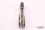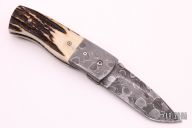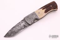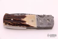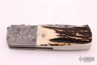 This CQC-7 Homage by Jerry Duran features a Damascus blade with notched thumbrest and a thumbdisc. The Damascus looks like it might be motorcycle chain or something like that. The handle has matching dovetailed Damascus bolsters, stag scales, titanium liners with jeweled interiors, stainless steel backspacer. Has some scratches, otherwise good condition.