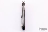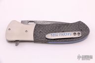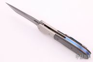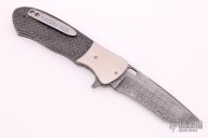 This sole-authorship knife by Bill Coffey features a Damascus blade with flipper. The handle has titanium bolsters, silver lightning strike carbon fiber scales, jeweled titanium liners, and an anodized titanium backspacer, tip up titanium clip. Comes with a felt case. Excellent condition. Nice blade seating and lockup.