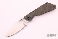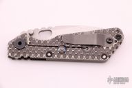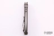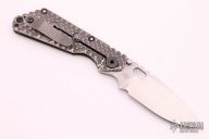 This SNG DGG by Strider has a stonewash spear point blade with dual thumb studs, thumb hole, and notched thumb rest. Handle is green G-10 and bead blasted titanium "Gunner Grip", lockbar stabilizer, and anodized titanium tip up clip. Nice detent, lockup and blade seating. Has a few light scratches, otherwise excellent condition. Comes with a zippered case.
