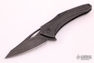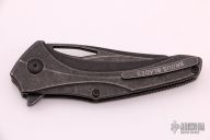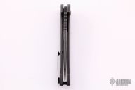 This Virtue from Brous Blades features a black tumbled drop point blade with swedge and notched thumb rust. The handle is comprised of black tumbled titanium scales over steel liners. Black stainless steel tip up pocket clip. Numbered 316/500. Includes padded vault style case, COA dated 01/04/16. Excellent condition.