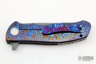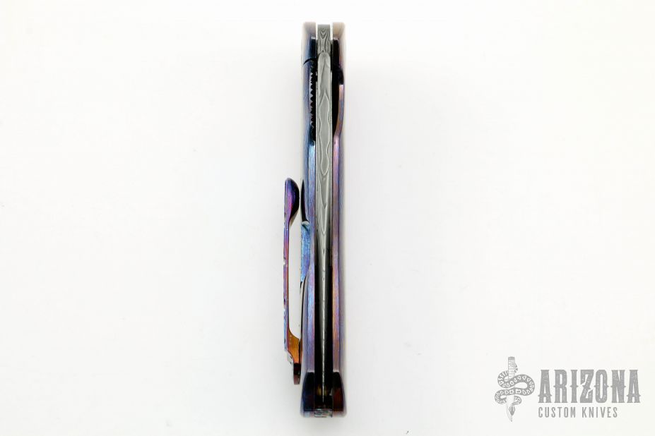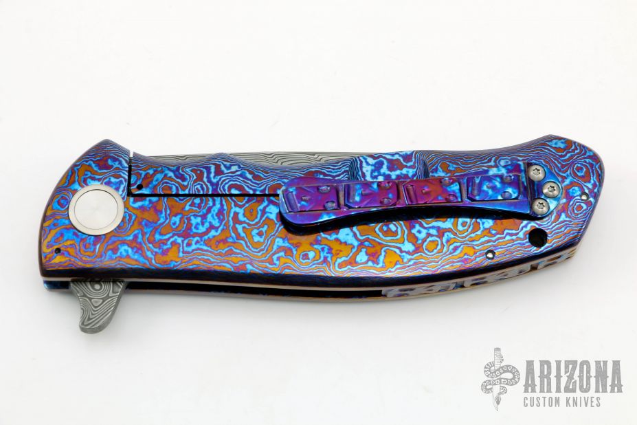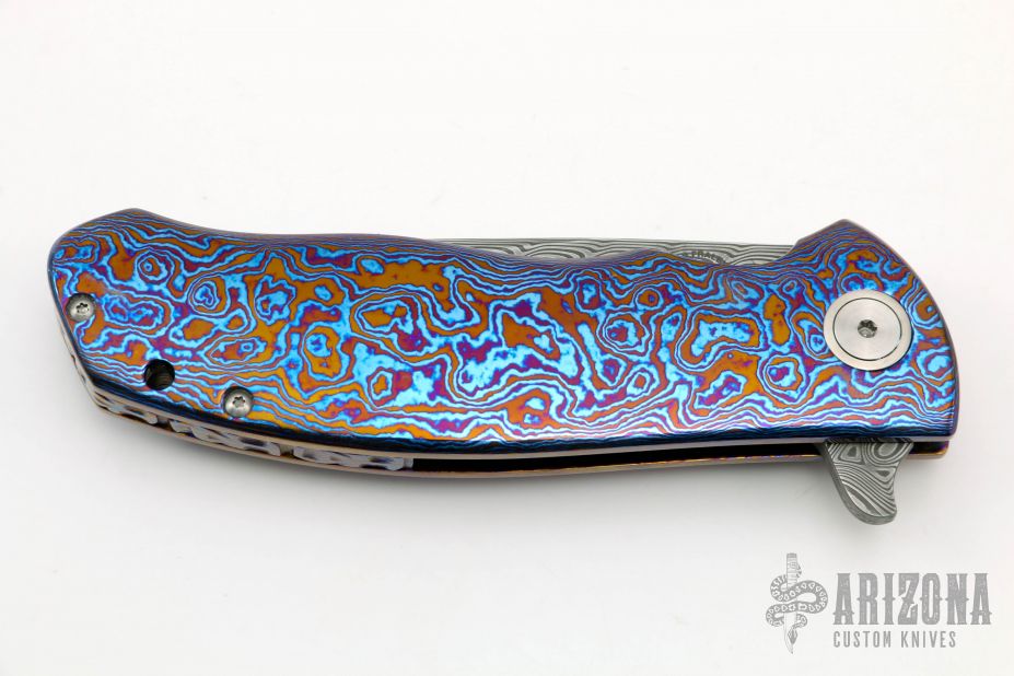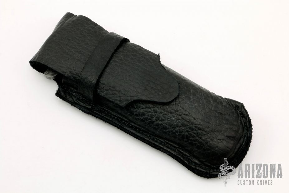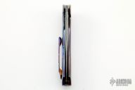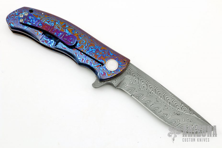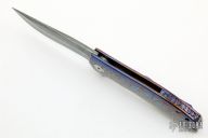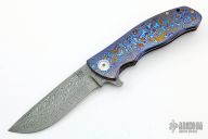 This Torrent 4.0 Framelock Flipper by DB Fraley features a Chad Nichols Damascus blade with flipper. The handle has a full mokuti frame, has mokuti lost skulls carved tip up clip and backspacer, lanyard hole at the butt. Rides on bearings, nice detent, lockup, action and blade seating. Comes with a leather case and COA dated 5/14/2021 and #53. Excellent condition.