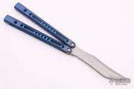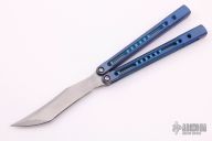 This Monarch balisong by Hansen Metals and JK Design features a milled, bead blast finish, upswept recurve clip point bade. The handles are comprised of anodized and tumble finish titanium with bronze phosphorus washers and steel bushings. Marked JK|JH on the handle. Comes with Zipper case, makers card, and stickers. New from Maker.
