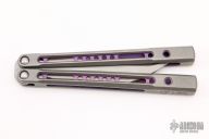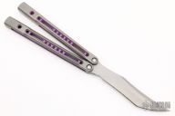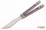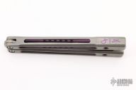 This Monarch balisong by Hansen Metals and JK Design features a milled, bead blast finish, upswept recurve clip point bade. The handles are comprised of two tone anodized and tumble finish titanium with bronze phosphorus washers and steel bushings. Marked JK|JH on the handle. Comes with Zipper case, makers card, and stickers. New from Maker.