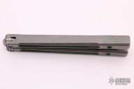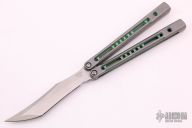 This Monarch balisong by Hansen Metals and JK Design features a milled, bead blast finish, upswept recurve clip point bade. The handles are comprised of two tone anodized and tumble finish titanium with bronze phosphorus washers and steel bushings. Marked JK|JH on the handle. Comes with Zipper case, makers card, and stickers. New from Maker.