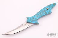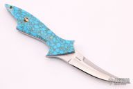 This Navajo Pixie by Jerry Hossom features nicely shaped turquoise scales with red liners and brass and mosaic pins. Hand rubbed satin finished blade with sharpened top edge, .191" blade stock and 1.077" blade depth, full tapered tang construction. Fits nicely in hand. Includes a zippered case. New from maker.