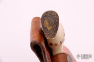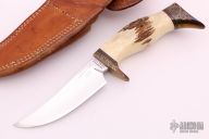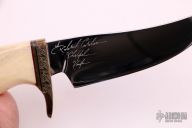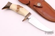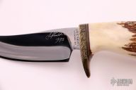The knife by Rod Chappel features a mirror polished blade with .171" blade stock and 1.215" blade depth, hidden tang construction. The recurve blade has "A Roderick Caribou Chappel....... Knife" etched on one side and "September 20th, 1978" on the other. The handle has an engraved brass guard and butt with a stag grip and black/brass/red spacers. Engraving done by Sherwood. Comes with a brown leather sheath. Excellent condition.