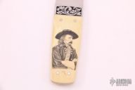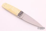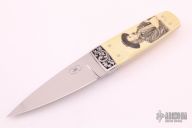 This knife by Steve Hoel features a hand rub satin finished blade with .121" blade stock and 1.177" blade depth, full tapered tang construction. The handle has engraved and dovetailed stainless steel bolsters, engraved by Lynton McKensie, mammoth ivory scales with scrimshaw by Bob Engnath. Comes with a zippered case. Excellent condition.