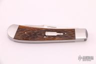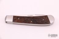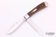 This Two-Blade Trapper by John Howser features hand rubbed satin finish blades with nail nicks. The handle has stainless steel liners with satin finish integral double bolsters, and jigged bone covers, stainless steel escutcheon. Half stops on blades. Great work. Has some light scratches, otherwise excellent condition.
