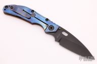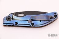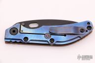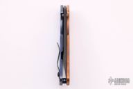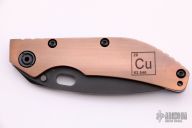This DCG BBNM Framelock Folder has a black chisel ground blade with dual thumb studs and thumbhole. Handle has a copper and milled and anodized titanium frame with a tip up clip, and titanium barrel spacers. Centered blade and great lockup and detent with zero blade play. Comes with Velcro case and COA. Excellent condition.