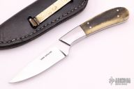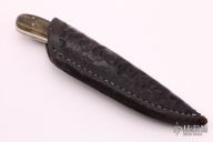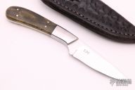 This knife by Ron Goulas features a high satin finished blade with .121" blade stock and .850" blade depth, full tang construction. The handle has stainless steel bolsters and giraffe bone scales. Comes with a hand tooled black leather sheath. "100" on the blade, this is his 100th knife. Has a few light scratches, otherwise excellent condition.