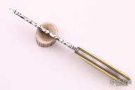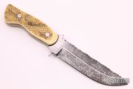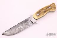 This fighter by Todd Schexnayder features a forge finished blade with fileworked spine, .251" blade stock and 1.376" blade depth, full tang construction. The handle has "Rattlesnake" paper micarta scales with black/yellow liners. Excellent condition.