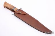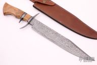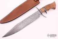 This Bowie by Sean Austin features a Damascus blade with a false top edge, .222" blade stock and 1.834" blade depth, hidden tang construction. The handle has a Damascus guard and sub-hilt, olive wood grip with a brass pin and black spacers. Comes with a brown leather sheath and COA. New from maker.