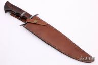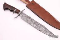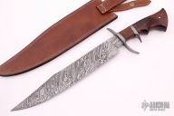 This Bowie by Sean Austin features a Damascus blade with a false top edge, .176" blade stock and 1.878" blade depth, hidden tang construction. The handle has a Damascus guard and sub-hilt, walnut wood grip with an aluminum pin and black spacers. Comes with a brown leather sheath and COA. New from maker.