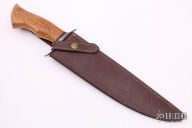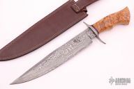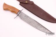 This Bowie by Sean Austin features a Damascus blade with a false top edge, .210" blade stock and 1.802" blade depth, hidden tang construction. The handle has a Damascus guard, olivewood grip with a brass pin and black/red spacers. Comes with a brown leather sheath and COA. New from maker.