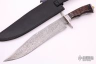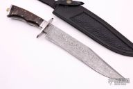 This Bowie by Sean Austin features a Damacus blade with a false top edge, .148" blade stock and 1.921" blade depth, mortise/frame tang construction. The handle has a stainless steel guard and frame, sheep horn scales with brass pins and tang nut. Comes with a brown leather sheath and COA. New from maker.