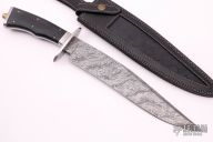 This Bowie by Sean Austin features a Damacus blade with a false top edge, .180" blade stock and 1.798" blade depth, mortise/frame tang construction. The handle has a stainless steel guard and frame, black canvas micarta scales with brass pins and tang nut. Comes with a black leather sheath and COA. New from maker.