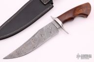 This Bowie by Sean Austin features a Damascus blade with a false top edge, .189" blade stock and 1.746" blade depth, hidden tang construction. The handle has a stainless steel guard, walnut wood grip with a brass pin and black/red spacers. Comes with a black leather sheath and COA. New from maker.