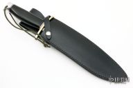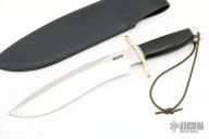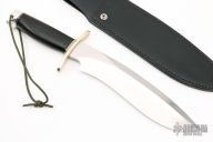 This Sasquatch by Randall Made Knives features a satin finished recurve blade with sharpened top edge, .334" blade stock and 2.212" blade depth, hidden tang construction. The handle has a forward curved nickel silver double guard, duralumin butt, black linen micarta grip with black/duralumin spacers. Comes with a black leather sheath (not original). #482 on the blade. Excellent condition.