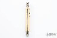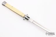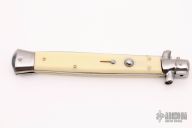 This Swivel Bolster from ACK Italy features a polished blade. The handle is comprised of stainless steel bolsters and pommel and white scales over brass liners and steel backspacer. Has a couple light scratches, otherwise excellent condition. Comes with original and sheath.