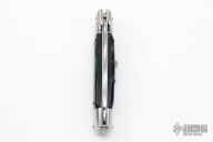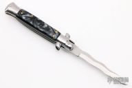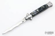 This Swivel Bolster from ACK Italy features a polished blade. The handle is comprised of stainless steel bolsters and pommel and black pearlex scales over brass liners and steel backspacer. Has a couple light scratches, otherwise excellent condition. Comes with original box.