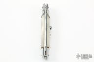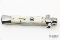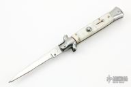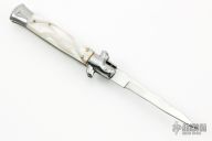 This Swivel Bolster from ACK Italy features a polished blade. The handle is comprised of stainless steel bolsters and pommel and white pearlex scales over brass liners and steel backspacer. Has a couple light scratches, otherwise excellent condition. Comes with original box and sheath.