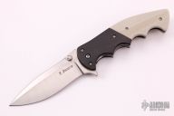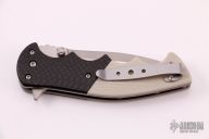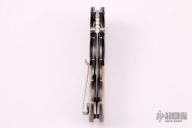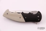 The Seeker linerlock flipper by Randy Doucette features a satin finish blade with fileworked thumbrest, dual thumbstuds and a flipper. The handle has carbon fiber bolsters, tan G-10 scales, bead blasted titanium liners and stainless steel clip. Nice blade seating, detent, and lockup. Excellent fit and finish. Excellent condition. Comes with a zippered case.