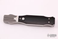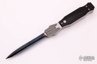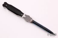 This XL SS Italia OTF Prototype by Reese Weiland features a hot blued Damascus double edged blade. The handle has a two-tone finished stainless steel frame, buffalo horn scales, satin finished button, anodized titanium charging handle. Comes with Velcro case. Nice action. Excellent condition. Marked PROTO on charging handle.
