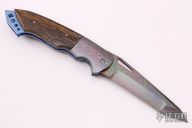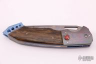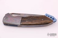 This Nighthawk Auto by Reese Weiland features a colored Damascus blade. The handle has matching Damascus bolsters, giraffe bone scales, anodized and jeweled titanium liners, and a brass and mammoth tooth backspacer. Red stone inset push button. Nice action, lockup and blade seating. "RW" inside backspacer. Comes with zippered case. Excellent condition.