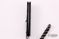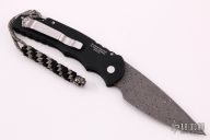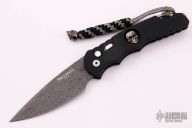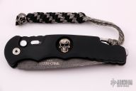 This Limited Edition TR-4 by Pro-Tech has a Devin Thomas "Fireball" Stainless Damascus blade and a sterling silver skull designed by Bruce Shaw inlaid in the black aluminum handle. Satin stainless steel clip. Black lip pearl push button. Steel glass breaker. Secondary safety switch. Custom lanyard. Serial number 13 of 30. Comes with original box and sheath. Excellent condition.