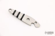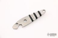 "Made of Crucible's CPM S30V cutlery steel, this simple keychain tool features a screwdriver tip/pry tool, a 1/4" hex opening and a bottle opener. That doubles as a 5/16" wrench. The rubber o-rings provide for a secure grip." Comes with original bag and card. Excellent condition.