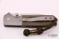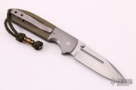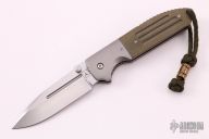 This TAD Dauntless by John W Smith features a drop point hand rub satin finished blade with dual thumbstuds and a notched thumbrest. The handle has bead blasted and dovetailed titanium bolsters, green G-10 scales, bead blast titanium liners and tip up titanium clip. Nice lockup, detent, and blade seating. Comes with original box. Has a couple light scratches, otherwise excellent condition.