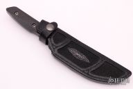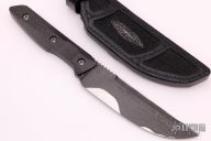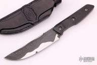 This Tanto by Peter Rassenti features a Stellite 6K core San Mai Damascus blade with notched thumbrest and false top edge, .177" blade stock and 1.365" blade depth, full tang construction. The handle has carbon fiber scales. Comes with a black leather sheath with rayskin inlay. Excellent condition. We were told this was the first Tanto fixed blade that Peter has made...