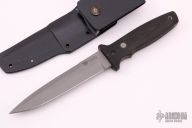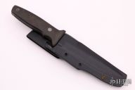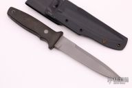 This Model 30 Battle Guard by Bob Terzuola features a bead blasted spear point blade with a sharpened top edge and notched thumbrest, .197" blade stock and 1.097" blade depth, hidden tang construction. The handle is black linen micarta with non-slip grip on the bottom of the handle and a lanyard hole. Comes with kydex sheath. Has a couple very light scuffs, otherwise excellent condition. #106I