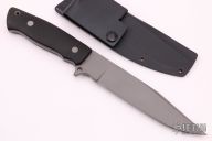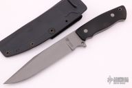 This Model 32 Fieldmaster by Bob Terzuola features a bead blasted blade with a sharpened top edge and notched thumbrest, .200" blade stock and 1.316" blade depth, hidden tang construction. The handle has black linen micarta scales with lanyard hole. Comes with a kydex sheath with belt loop. Has a couple light scuffs, otherwise excellent condition.