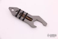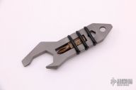 The BottleBug tool features a 1/2" wrench opening in the bottle opener area and a small pry tip/screwdriver. Made of .160" thick (5/32") CPM 154 semi stainless premium cutlery steel and measures 3 inches long.