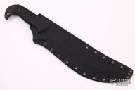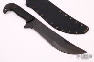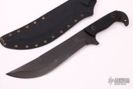 This Woodland Bowie by Mineral Mountain Hatchet Works features a black blade with false top edge, .245" blade stock and 2.041" blade depth, full tang construction. The handle has black canvas micarta scales with hollow tube pins. Excellent condition. Comes with Kydex sheath.