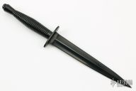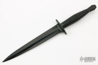 This Fairbairn-Sykes style dagger by Larry Harley features a double edged black blade, .246" blade stock and .974" blade depth, hidden tang construction. The handle is comprised of blackened steel guard with a ribbed and blackened (brass?) handle. Excellent condition. #650 on the ricasso.