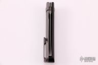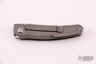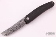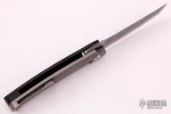 This knife by Darriel Caston features a Vegas Forge Damascus tanto blade with notched thumbrest and flipper. The handle has a carbon fiber and blasted titanium frame, carbon fiber backspacer, blasted tip up titanium clip. Rides on bearings, nice detent, lockup and blade seating. Excellent condition. Comes with a zippered case.
