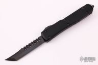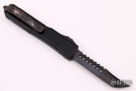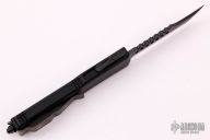 This Ultratech Hellhound by Microtech Knives features a black stonewash DLC blade with notched thumbrest and fullers, false top edge. The handle has a black aluminum frame with tip down black stainless steel clip, black DLC hardware, black titanium thumbslide. Comes with original box and papers. Excellent condition. Dated 09/2021 and s/n 547.