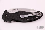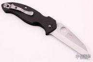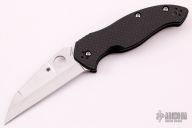 The Canis from Spyderco is a spectacle of a knife designed for everyday carry. The blade is made of CPM-S30V, and features a truly unique blade profile and grind. It has a Wharncliffe shape, a flat grind, and a ground out section which reduces weight, but full spine thickness near the tip to reinforce it. The handle is made of a carbon fiber/G-10 laminate with a gentle texture to hold it nicely in the hand.