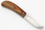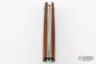 This scale release auto by Mike Whiskers Allen features a satin finished blade with fileworked spine. The handle has wood scales, stainless steel liners, and a fileworked stainless steel backspacer. Has a couple light scratches, otherwise excellent condition. Nice action, lockup and blade seating. Comes with a zippered case.