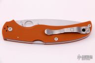 This Native Chief takes the time-tested design of the original and stretches it out to create a longer and slimmer profile with even more cutting performance. Burnt Orange G-10 scales and a full-flat ground Rex 45 steel blade solidify the design. Textured G-10 handle scales are backed up by a precision-machined lockback mechanism. 4-position pocket clip allows for fully ambidextrous tip-up or tip-down carry. Excellent condition. Comes with original box and papers.