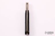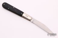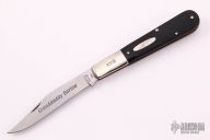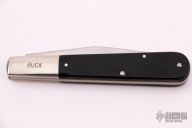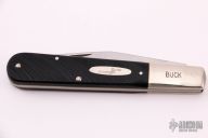 This slipjoint by Buck Knives features a satin finished blade with nail nick. The handle has nickel silver bolsters, sawcut black covers, brass liners and stainless steel spring. Has half-stop, flush in all positions. Comes with original box. Has a few light scratches, otherwise excellent condition.