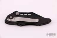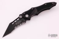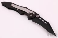 This Vector manual folder from Microtech features a black partially serrated blade with dual thumb studs and notched thumb ramp. The handle is comprised of black anodized aluminum frame with non slip inserts over green barrel spacers. Stainless steel inlaid lockbar. Stainless Steel tip down clip. Dated 8/99. Excellent condition.