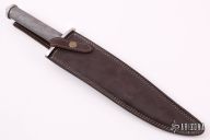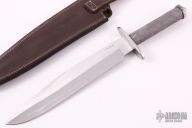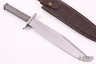 This Bowie by Andre Ronald features a satin finished clip point blade with false top edge, .191" blade stock and 1.834" blade depth, hidden tang construction. The handle has a stainless steel guard and butt with a knurled steel grip, the butt cap does not screw off. Comes with a brown leather sheath with belt loop. New from maker. Comes with COA dated July 22nd, 2019.