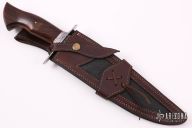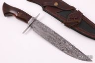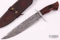 This Bowie by Andre Ronald features a Feather Damascus blade with false top edge, .173" blade stock and 1.872" blade depth, hidden tang construction. The handle has an engraved stainless steel guard, walnut grip with a brass pin. Comes with a brown leather sheath with belt loop. New from maker. Comes with COA dated April 12th 2019.