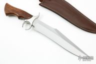 This Bowie by Andre Ronald features a satin finished blade with false top edge, .182" blade stock and 2.040" blade depth, hidden tang construction. The handle has a stainless steel guard, walnut wood grip with a brass pin. Comes with a brown leather sheath with belt loop. New from maker. Comes with COA dated July 21st, 2019.