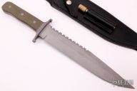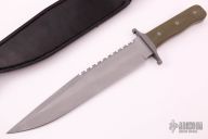 This survival knife by RDW Knives features a bead blasted clip point blade with sharpened and serrated top edge, .242" blade stock and 1.847" blade depth, full tang construction. The handle has a bead blasted stainless steel double guard with green G-10 scales. Comes with black leather sheath with EZ-LAP sharpening rod. Excellent condition.